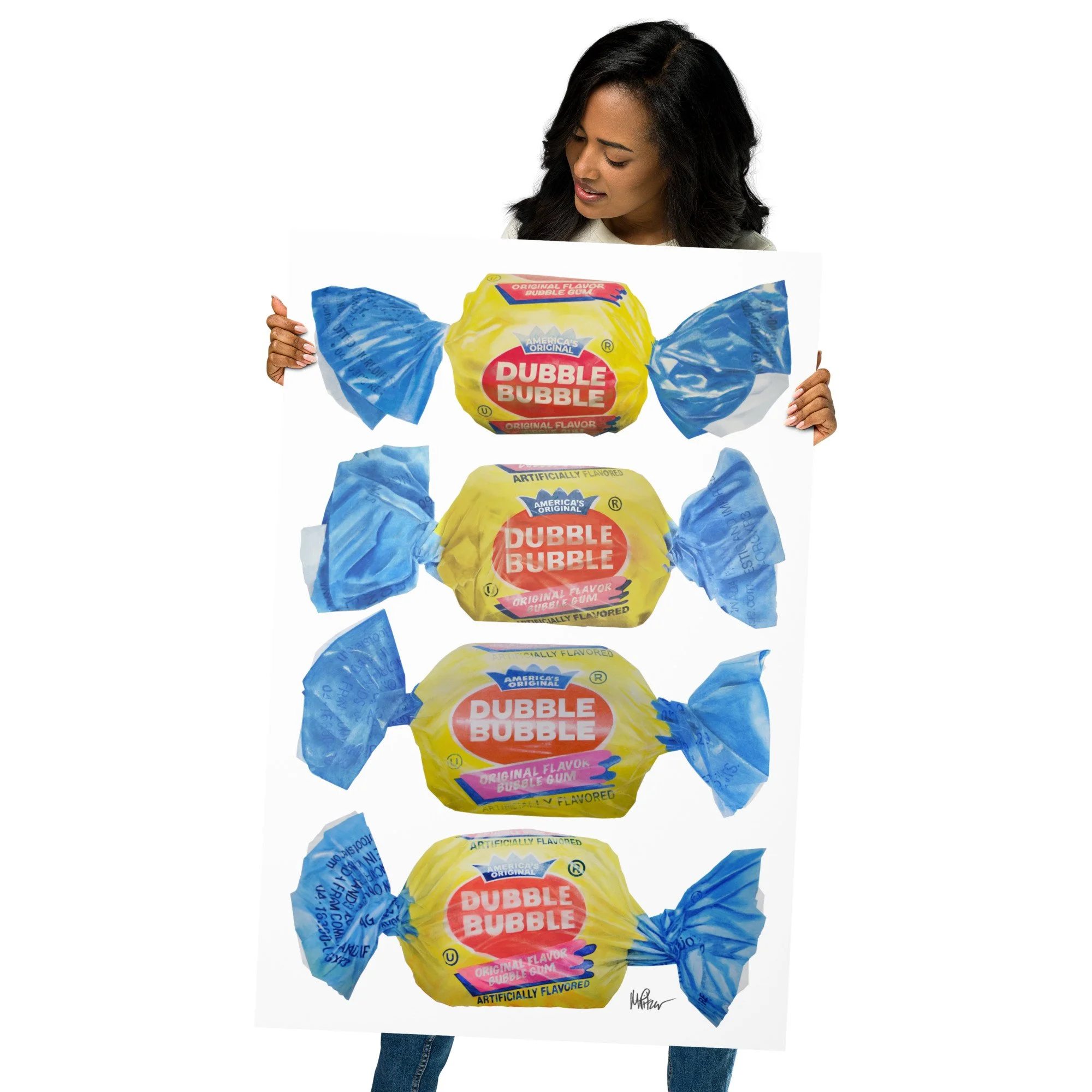 This poster combines 4 of my pop-realism graphite & colored pencil drawings of my DUBBLE BUBBLE Gum drawings and is produced on quality matte poster paper using archival inks. The finished size is a standard 24”×36” size, making it easy to frame.